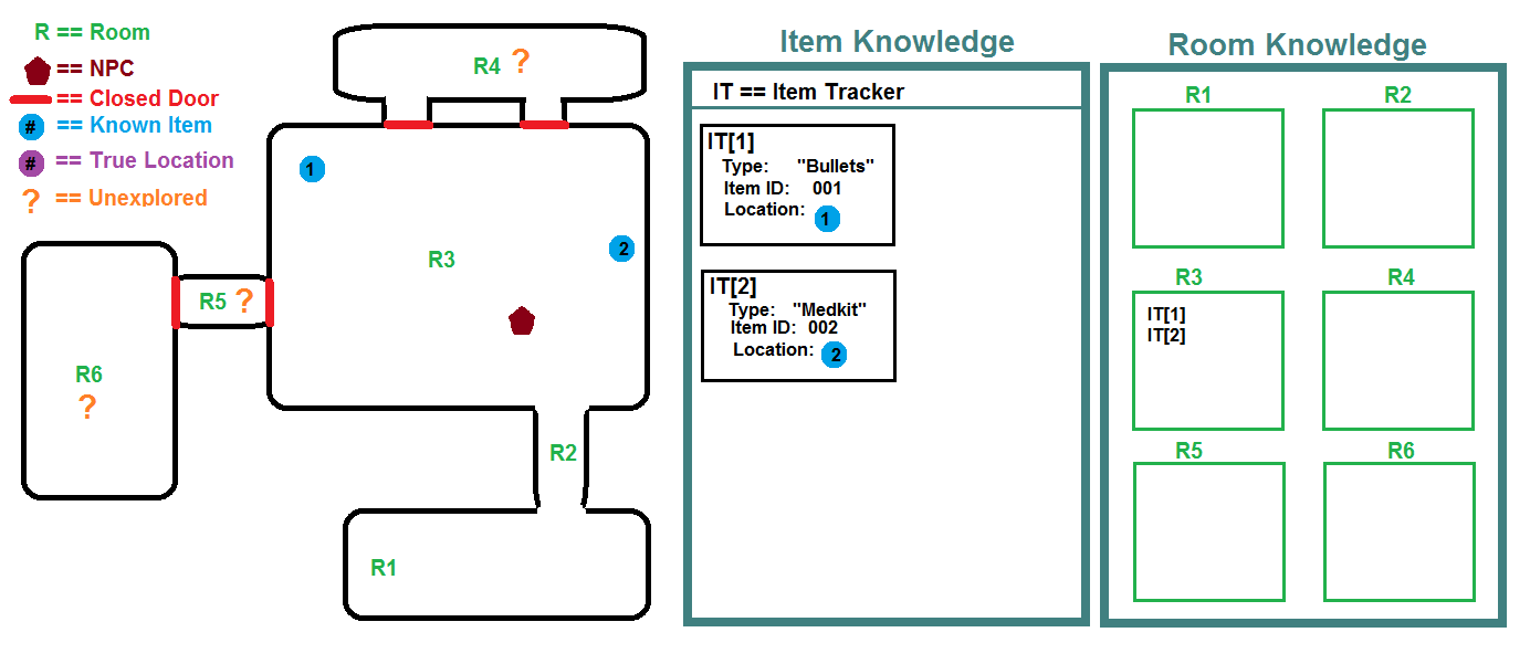 For the sake of brevity, this next example is only following the NPC's knowledge of items. In all actuality, the state of doors and other details would be tracked at the same time. The image below is the starting condition for a NPC just entering the level. He doesn't know anything about the world, yet, other than the location of rooms.